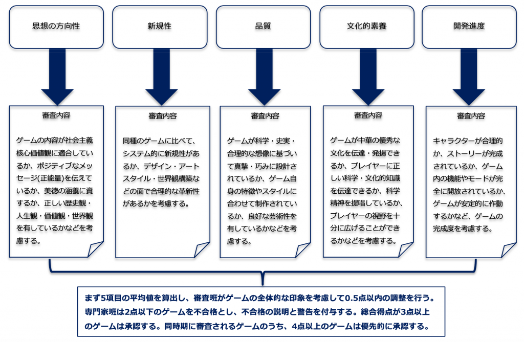 新たな審査体系では、中宣部出版局がゲームの審査・評点作業を担う。2人以上の専門家がゲーム作品を審査する。「思想の方向性(観念導向)」、「新規性(原創設計)」、「品質(制作品质)」、「文化的素養(文化内涵)」、「開発進度(開発程度)」の5項目について評点を行い、これらを合計して総合得点を算出する。