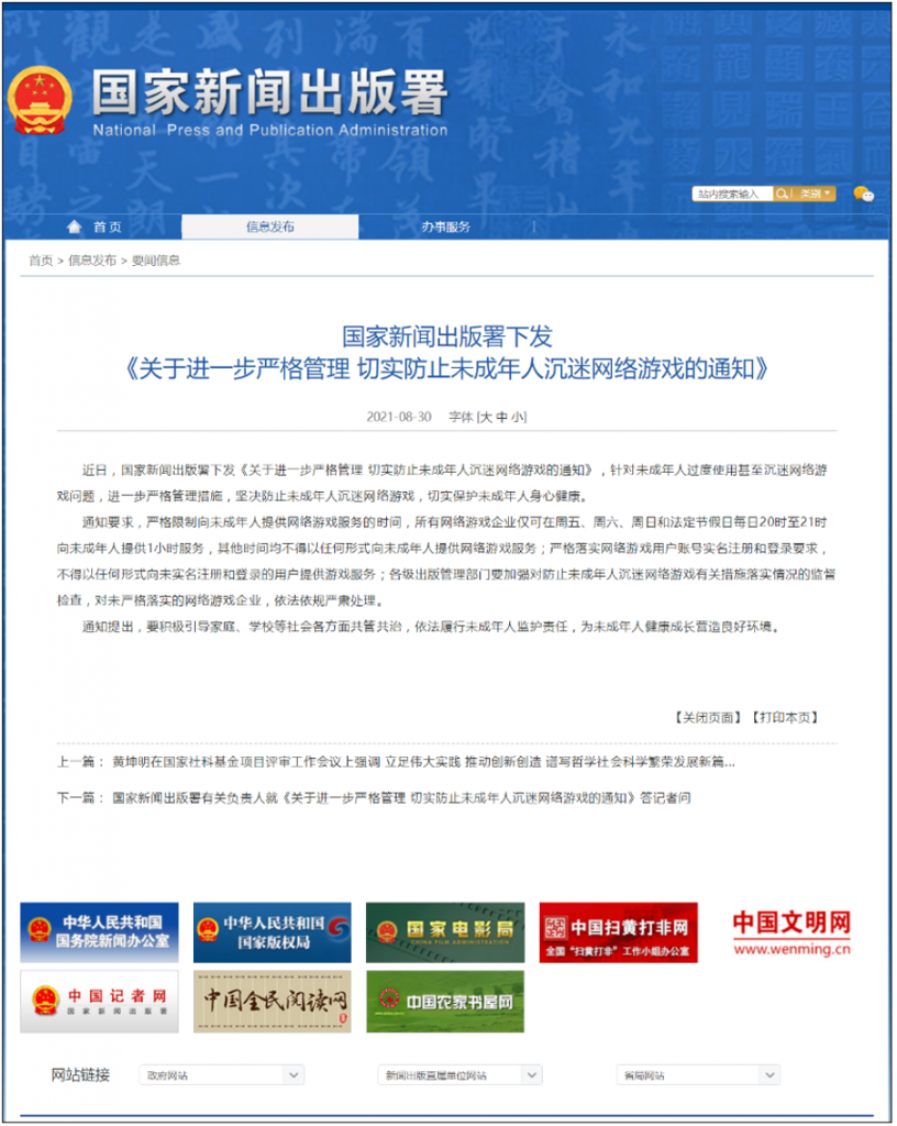 2021年8月30日、国家新聞出版署が最新の通知を発表した。通知の内容は、未成年者のオンラインゲーム依存防止を適切に実行すること。この通知は、未成年プレイヤーのゲームプレイ時間を大幅に減らし、ゲーム時間を厳格に制限することを求めている。そのため、史上最も厳しいゲーム依存防止規制であると言われている。